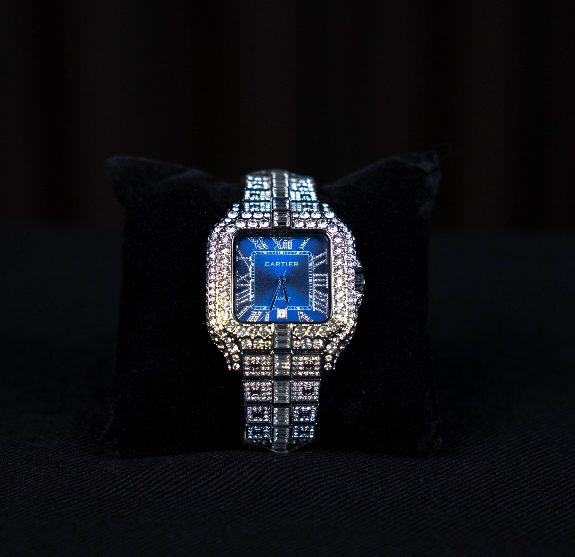 A dazzling statement of craftsmanship and prestige — the Cartier Iced Blue features a deep sapphire dial framed by a fully diamond-set bezel and bracelet. Precision-engineered luxury meets timeless design, making it the perfect centerpiece for any collection.
